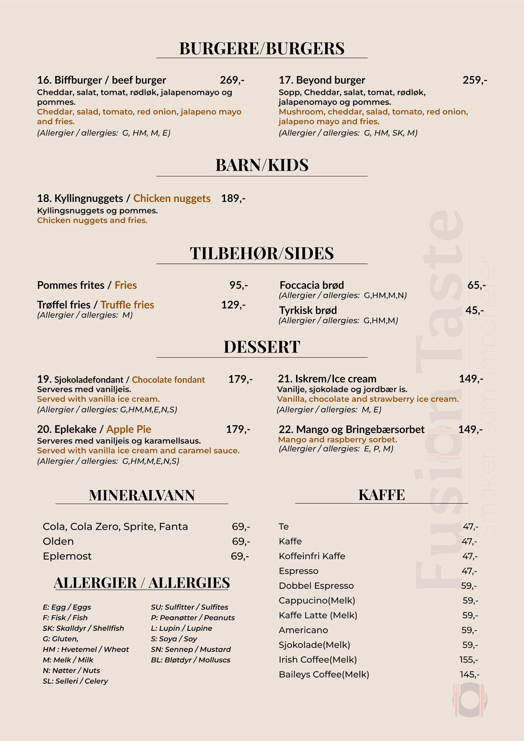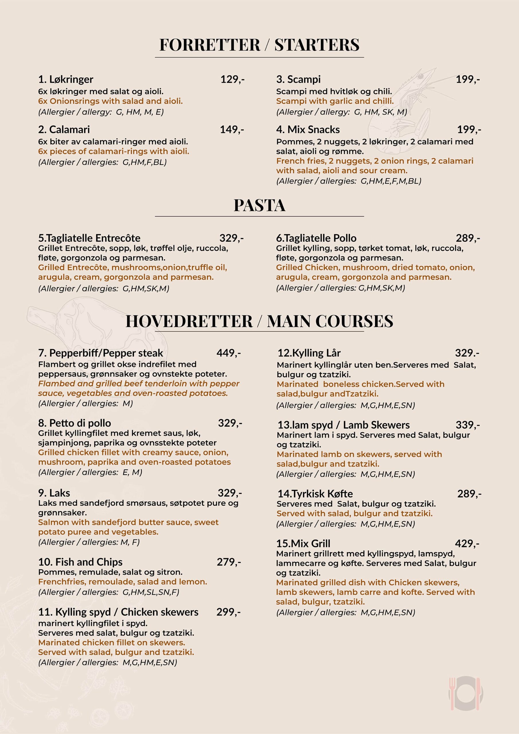 Meny prisene gjelder for å spise inne i restauranten